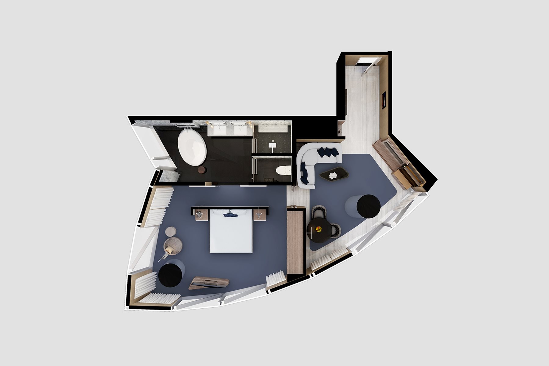 Striking views across the bay invite you to linger in the expansive lounge and dining area. Bright and spacious, Executive Suites at Crown Towers Sydney feature an enclosed bedroom with a sculptured bath, dual vanities and luxurious rain shower.