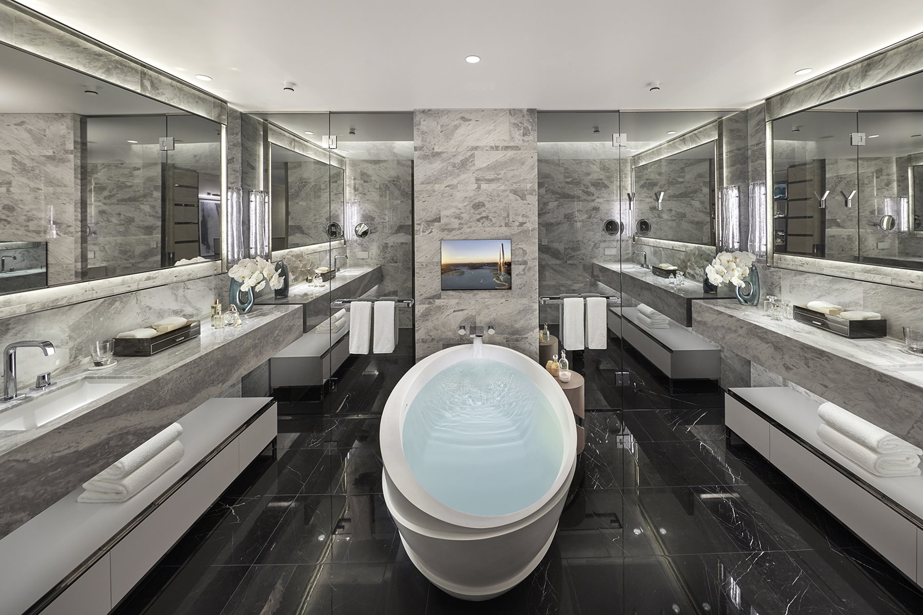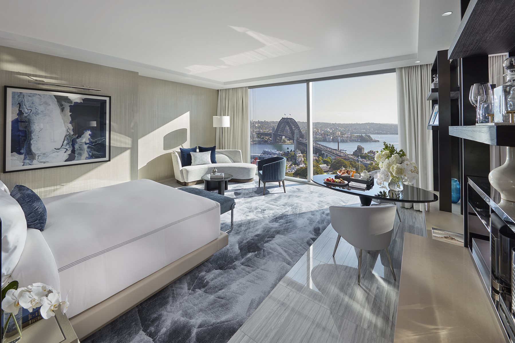 Indulge by the sky blue pools before retreating to the luxurious Harbour Bridge Studio, which offers an expansive space with a richly upholstered curved sofa and dining table for two. Take in the magnificent Sydney Harbour from the custom-made King-size bed, or recline in the large bath that takes prized position in the double sized ensuite. Crown’s intuitive touch screen technology completes the contemporary elegance of the room allowing each guest to personalise their stay.